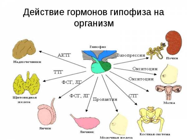 Эндорфины уменьшают чувство боли, контролируют менструальный цикл и сигнализируют использование репродуктивных органов. Гормоны роста определяют, как питательные вещества, попавшие в организм будут использоваться и стимулировать рост костей. Тиреотропин сотрудничает с щитовидной железой. Пролактин активизирует выработку молока в женской груди. Кортикотропин стимулирует надпочечники.