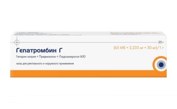 Благодаря входящим в состав Гепатромбина Г гепарина натрия, ацетата преднизолона и лауромакрогола 600, препарат оказывает комплексное воздействие: веносклерозирующее, антитромботическое, противозудное, местноанестезирующее, противоотёчное и противовоспалительное. Применяется как при наружном, так и при внутреннем типе геморроя. Стоимость мази составляет порядка 170 рублей.