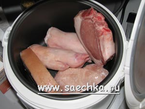 Закинула в мультю ноги, 600 г свинины, 150 г куриной ляжки. Говядины в доме не завалялось.